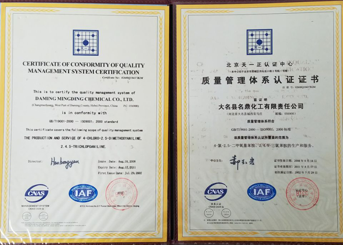 企業(yè)擁有自己投產(chǎn)的污水處理廠一座。在2001年獲得自營進(jìn)出口權(quán),2002年通過ISO-9000國際質(zhì)量體系認(rèn)證。企業(yè)分別于94年和2003年被河北省科委、河北省科技廳評(píng)定和認(rèn)定為《河北省科技企業(yè)》、《河北省高新技術(shù)企業(yè)》、98年被河北省八部委評(píng)定為《優(yōu)秀民營企業(yè)》?!?-氯-2,5-二甲氧基苯胺等三種產(chǎn)品》,榮獲河北省《高新技術(shù)產(chǎn)品》獎(jiǎng),并獲得國家科委金獎(jiǎng)、河北省優(yōu)秀新產(chǎn)品二等獎(jiǎng)、邯鄲市科技進(jìn)步一等獎(jiǎng)。企業(yè)已是國內(nèi)外精細(xì)化工行業(yè)的一顆璀璨明珠。